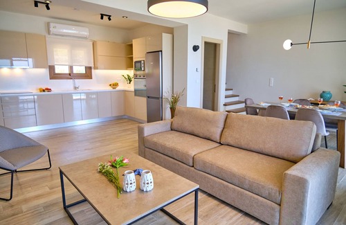 Armikes Beachfront Suite 4:This luxury modern furnished suite covers a living space of 100sq.m in two levels. Entering the spacious suite there is an open plan living room, kitchen, wc with washing machine and dining area. The kitchen is fully equipped with all amenities and electrical appliances as well as microwave and dishwasher. The living room has large glazing doors with access to a balcony with a magnificent view to Agios Georgios Bay. Interior staircases lead to the upper floor where the bedrooms are. One bedroom features a king size bed and the other two twin beds. The rooms are air conditioned, have modern wardrobes with interior lighting, Smart TVs, boudoir and access to a balcony with panoramic sea views. A spacious bath with rainfall shower is set next to the bedrooms.