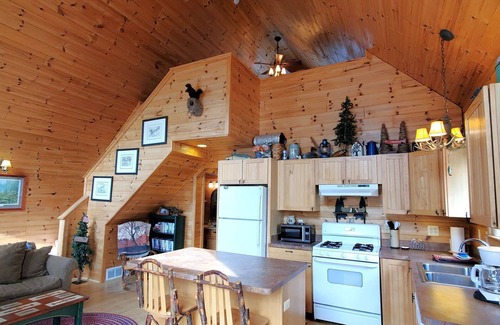 Inside, the open main living area features warm wood accents, large windows overlooking the river, and a central stone fireplace with real wood-burning charm. The main-level bedroom includes a queen bed, and the upper loft offers four twin beds—perfect for families or small groups. A full bathroom with a tub, plus a washer and dryer, add comfort and convenience for extended stays.