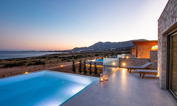 Each villa is 75 sq.m. elegantly decorated with two bedrooms (one master) air conditioned and 2 wc (hairdryer). It can accommodate 4-5 people and offers an equipped kitchen with fridge and cooking hobs, microwave, water kettle, cooking utensils, espresso machine, dining area, spacious living room with sofa and 43-inch smart tv. Veranda 80sq.m. outdoor living room, dining area, sun loungers, shower, private pool with hydromassage with full sea views. Ideal for families and couples looking for a luxurious holiday retreat.