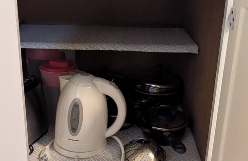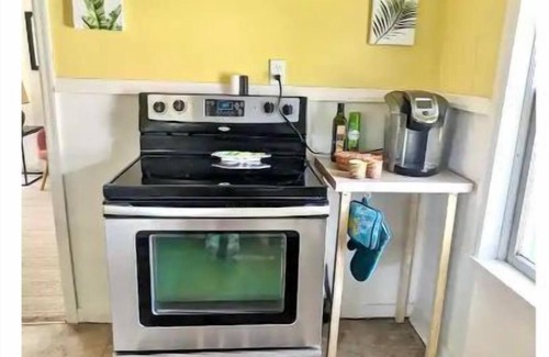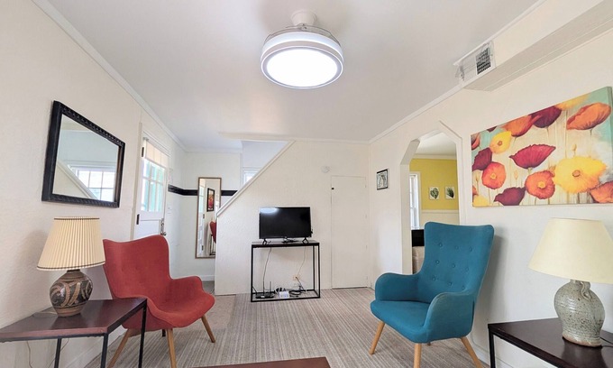 The first floor includes an in-unit washer and dryer(free), fully-stocked kitchen, bathroom, and cozy living room with futon that converts to a full sized bed (linens for the futon are located in the closet under the stairs). Roku HDTV with a Chromecast plugged in, just enter your streaming passwords and enjoy a movie.