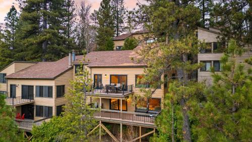 - Stunning lakehouse lodge with a deck, fireplace, lush patio & lake access