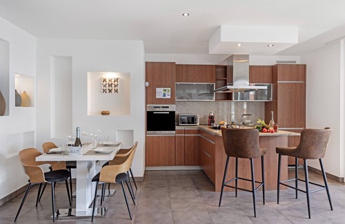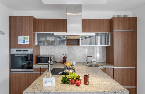The stylish balcony apartment is easily reached by lift and inside benefits from a bright and spacious open plan layout. A modern sofa and flat screen TV complement the sitting area, which is accompanied by a contemporary-fitted open plan and full kitchen with dishwasher, a breakfast bar and a dining area for 4. A modern master double bedroom with balcony access is accompanied by a 2nd double bedroom and a modern family bathroom suite. Private laundry facilities also promise added convenience whilst away.