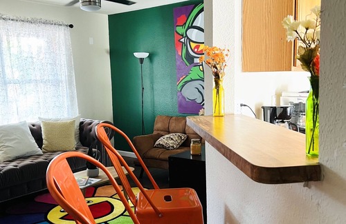 Enjoy your stay at this unique and tranquil casita in a well-established region. This art-centric getaway doubles as a gallery, showcasing many of the artistic talents of San Antonio. Housing many of the amenities you will need during your stay from coffee, towels, blankets, boardgames, books, pool table, work desk, shaded deck, art, this house guarantees a safe and inspiring stay for your family. The space is perfect for 4 but comfortably accommodates 5. Thanks! we can't wait to host you! :)