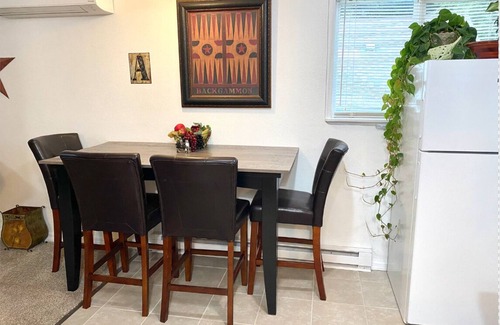 Outside you'll find a small deck off the kitchen, with BBQ, cooler, and some seating. Down the stairs is a privately fenced back yard with table and chairs, and a snuggly bench for chatting or taking photos. Enjoy the yard art, and flowers and vines in the warm seasons, while you relax in your cozy green space.