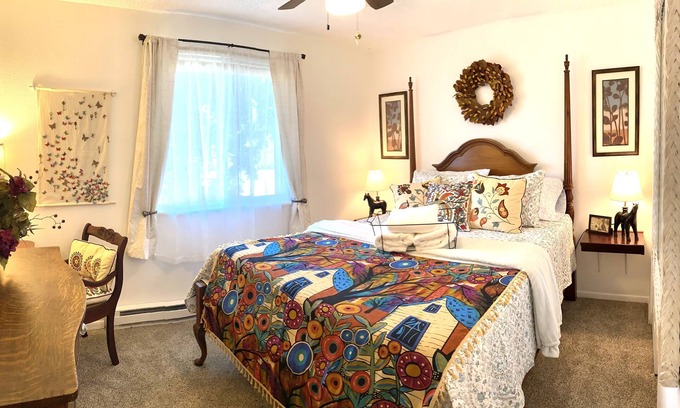We are Mom & Pop hosts and strive to offer the personal touches that a corporate-owned place can’t. We use the back lot (separate from the Art House yards) quite a bit for gardening and some small craft events in warm weather. Don’t be surprised to see one of us working there, or raking leaves out front, etc. We are semi-retired and live just around the corner.