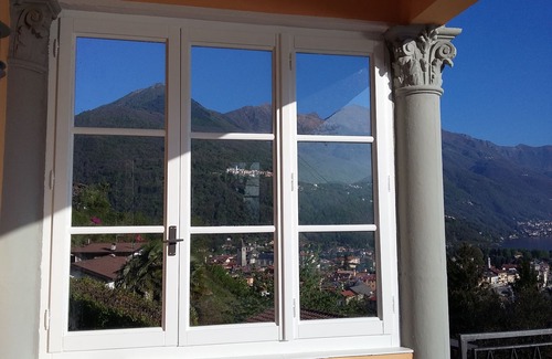 Spacious rooms with high ceilings, some with stucco, fully equipped kitchen, comfortable seating in the salon, several terraces and balconies, all with open lake views, mountain views and views over Cannobio. Spacious garden with palm trees and flowering shrubs and shrubs as well as some art objects. The pool offers a refreshment in summer. It is not heated and is available in the 2019 season from mid-April to mid-October. In the summer months, the pool has sun all day, as do the sun terraces and balconies. Since the house is oriented to the northeast, the sun is saying goodbye more and more from autumn, so there is still about 2 hours of sun in October, for example. In spring and autumn, use the fireplace in the living room with the free firewood that can also supply the upper rooms with cozy warmth.