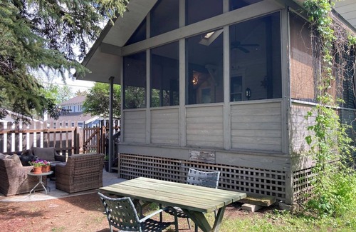 Giant spruce trees shade this unique & art-filled cottage. Everything you need is w/in easy reach in the main floor 1 bd 1 bth space. Perfect for a couple & equipped w/ a toddler bed, travel crib & highchair so it can work for a young family, too. If you need more space, reserve the whole house to accommodate 8 guests + an infant & toddler. Get a glimpse of the Bighorn Mts from the front porch with your morning coffee, grill in the fenced yard & end with a local brew on the screened back porch.