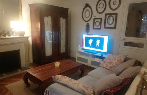 -a large double living room - dining room with grand piano (tuned and reserved for people respectful of the instrument), with an atmosphere both modern and charming. Parquet, moldings, Prussian stove and period fireplace (beware, fires prohibited in the building !!).