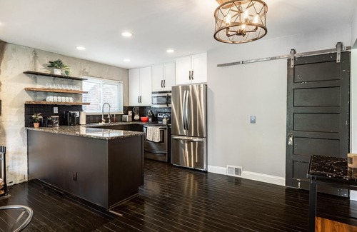A 10-minute drive to downtown Birmingham and Berkley, this newly remodeled Southfield ranch features four beautiful bedrooms (each with its own smart TV) including a primary bedroom / bathroom suite. The kitchen was completely re-done and includes a gas range, granite countertops, custom wood shelving, and stainless steel appliances. Not to be outdone by the main floor, our basement is the secret highlight of the house with an entertaining area along with a work area featuring two full standing-desk, dual-monitor setups with docks, keyboards, mouses, and comfy office chairs! And to top it all off, relax or entertain in our back yard where we have a propane grill, a patio sitting area, string lights, a fire pit, and plenty of seating! With plenty of off-street parking, including space for a couple cars in our driveway, and also ample free street parking, this is the perfect spot for any gathering or extended getaway!
