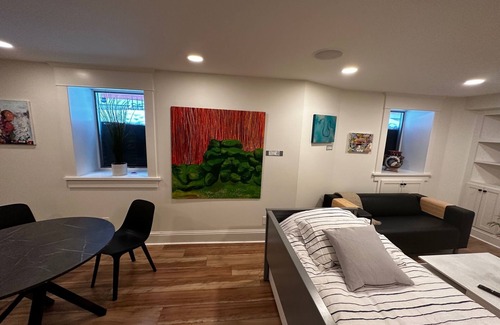 Enjoy a stylish experience at this centrally-located unit near Lake Bde Maka Ska on 32nd street and Humboldt Ave South in the safe part of uptown Minneapolis. This modern lower level unit has been curated with lovely Artistic renditions, a queen and a day bed to easily fit 3-4 people (an additional air bed is available as an option). a large TV, fireplace, central air conditioning, and a full bathroom. There is no kitchen but we do have essentials for coffee, tea, microwave, full fridge etc.