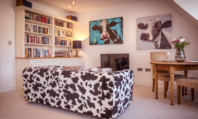 An eye-catching cowprint sofa and funky cow artwork style the lounge area, and there is a flatscreen TV, stereo, DVD player plus a wealth of DVDs, CDs and books to browse.