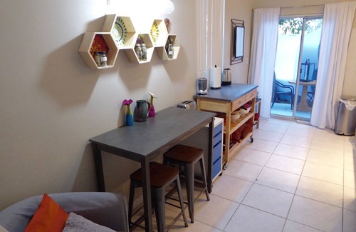 The apt. is full of interesting art and shapes, it is not just comfortable, but up lifting. it is a one bedrooms with king size bed, very comfortable mattresses, soft linens, closets and work table. The layout of the apt is open, flowing from kitchen to dinning area to living room.There is one full bathroom. The kitchen has anything you might need, a dishwasher, fridge, stainless steal workspace, microwave, stove, coffeemakers, toaster, mixer, dishes, cookware a small amount of food, oil... Please enjoy the beautiful new salt water pool with spa, the seating areas in the large garden, the lounge chairs and the beauty of the flowering trees and plants. It smells heavenly. It is shared with the other 2 short term apt in the building. The living room has 2 sofas, smart TV and WIFI. Please use your own streaming app I provide Netflix . There is a washer and dryer in one of the closets.The building is blue and orange, it has 3 apt.
