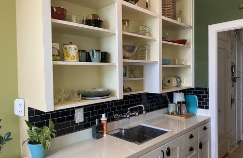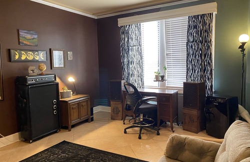 This is a private unit with colorful kitchen and full bath, walk in closet and vanity. The main room offers a full size bed area along with a desk next to the window, a couch area to unwind and a large flat screen TV with Chomecast.