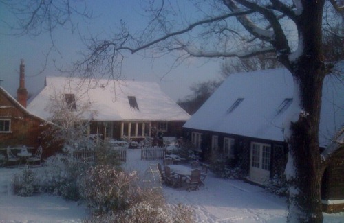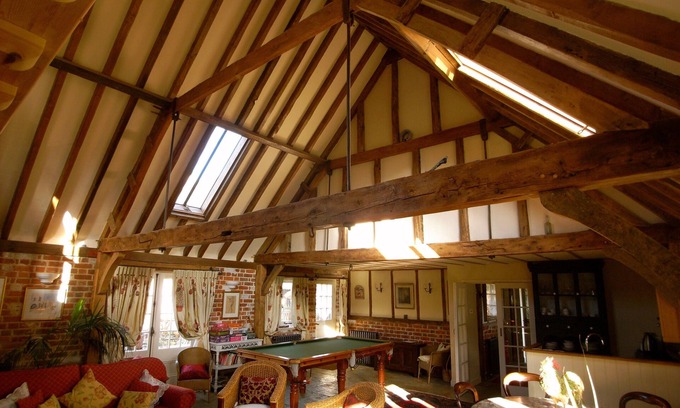 Ancient timbers, beautiful brickwork, a vaulted ceiling, old Persian rugs on a stone floor , comfy leather sofas in front of the log-burning stove – just some of the charms awaiting you in the Barn at Logmore Farm.