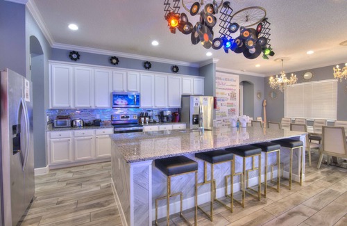 Each room features a popular music genre, from rock to country, jazz, hip-hop, and so much more. 20 mins from Disney World. Enjoy a private home theater, two-lane bowling alleys, wall-to-wall living room TV, flat screen bedroom TVs, 2 refrigerators, 2 washers/dryers, 1 GB wifi speed, etc.