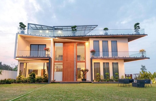 The villa includes Wi-Fi, Smart TVs, BBQ setup, bonfire area, generator backup, and parking for up to 50 cars. Pet-friendly and surrounded by nature, it's a serene escape just minutes from the city’s connectivity.