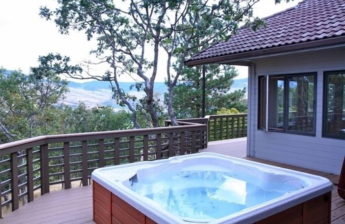 Lounge in the library, relax in the great room as the morning fog drifts across the Rogue Valley, or share a great bottle of local wine while you sink into the leather sofas in front of the grand river rock fireplace. In the cool evening after a play you can soak in the hot tub on our enormous deck and watch for shooting stars. The milky way is very bright in our clear, cool air at 2500 ft. During the winter we even get the occasional snowfall!