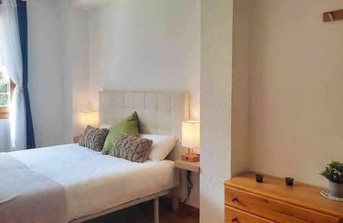 This cozy apartment has a double room with a double bed, a spacious built-in wardrobe, a couple of nightstands with their respective lamps, and a chest of drawers, ideal for enjoying some reading time. It has a window with mountain views.