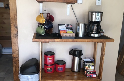 Aspen Cabin is one of two personal sleeping cabins at WhisperingWoodsAKcabins. It includes a toilet and sink while a cooking and bathhouse cabin is just a few steps away. Each sleeping cabin has a minifridge and its own private deck as well as seating inside. The communal kitchen/bathhouse has a small kitchen, dining table, coffee station, microwave, laundry facilities with soap, and two complete bathrooms with tiled showers. Other shared amenities include a gas BBQ, chest freezer, and outdoor fire ring with a swing around grill