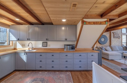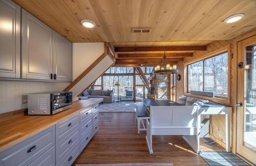 This 2-bedroom, 1-bath chalet comfortably accommodates your group. The primary bedroom is conveniently located on the main level, while the upstairs second bedroom offers privacy and charm. A loft area provides additional living space—ideal for game nights, reading, or simply unwinding.