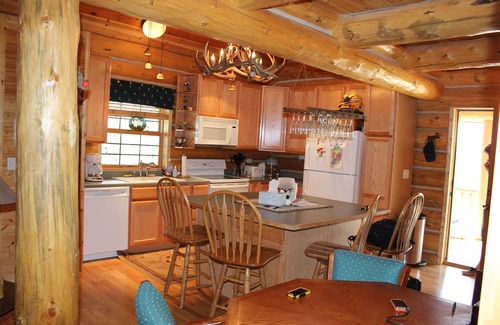 As you arrive at Aspen Sunset, you’ll be welcomed by gorgeous scenery surrounding Kenosha Pass and Michigan Hill. When you enter the cabin you will be stunned by the rustic cabin decor. The gorgeous logs surround the exterior walls of the cabin. All interior decorations were hand selected or made by the owner to provide the perfect cabin feel and appearance. Make yourself right at home in the fully equipped kitchen and fully furnished cabin. Gather around the kitchen and enjoy home-cooked meals with seating to accommodate 4 at the dining table and 4 at the large island.