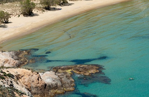 ASPES #2 | Prassini: Breathtaking view, over Psili Ammos beach (Greek award winning beach). An independent residence-complex built on the rock, perfectly in tune with the environment, with an exclusive view of the unique blue of the Aegean sea. PRASSINI is a charming residence with a modern, fully-equipped kitchen, an open plan living room area, two separate bedrooms with ample closet space (one with a double bed, the other with 2 singles that can be joined to create a double.). Top quality mattresses and bedding supports the comfort of your rest time and quality of your sleep. A spacious bathroom with a rainfall shower head. The villa is ideal for 4 people but can accommodate up to 6 comfortably. Self catering. Facilities: Complimentary Wi-Fi Complimentary welcome basket with Greek products Fully-equipped kitchen (large fridge, cooker, all necessary utensils for preparation of meals) 2 separate bedrooms Top quality mattresses and bedding and linen ensuring a comfortable rest Spacious bathrooms with rainfall shower heads (complimentary toiletries and shampoo, plenty of towels and hairdryer) Private terraces with folding, crystal panel wind blocks Portable Air Conditioning units Spacious Car park area hidden from view • 270+ DEGREE VIEWS. Each residence is surrounded by ambient terraces resulting in a 270+ degree view! You enjoy views to Psili Ammos beach (award winning beach, 5 min drive or 10 min downhill trekking from Aspes), to Agios Ioannis beach, to the Aegean blue archipelago (sea) and partly to picturesque "Chora" (Serifos' main little town) to the north. • RELAXATION. Our philosophy and aspiration is to offer a relaxing, quiet environment so that you can enjoy the sun, the sea, the views and Serifos' wonderful nature.... • ENJOY THE MEDITTERENEAN OUTDOOR EXPERIENCE. Each residence is built at a different level, therefore you enjoy unlimited views, you do not have optical disturbance from neighboring guests and in the large terrace of your villa you enjoy private unlimited views. Your terrace is equipped with a pergola to offer shade and protection from the Mediterranean summer sun, along with sun beds, and a dinning set (table with comfortable seats).