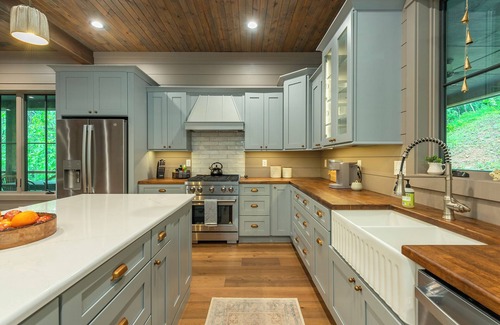 The main kitchen is fully stocked with everything you need to cook and serve meals during your stay. It features modern appliances, cookware, utensils, and a large center island with seating for four, perfect for casual dining or chatting while you prepare meals. In addition to the main kitchen, the cabin includes a convenient kitchenette with a mini fridge, offering extra flexibility for storing drinks and snacks — ideal for larger groups or extended stays.