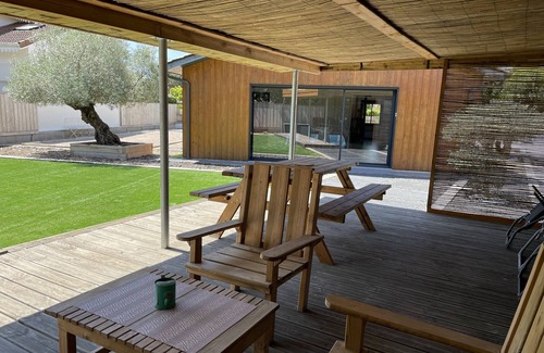 Outside: a garden of 800m2 including a big terrace of 30m2 with barbecue, living room of garden, deckchairs, modern decoration and illuminated the evening for evenings outdoors. The garden is landscaped: on the menu, slates, pebbles, palm trees, Olivier, bowling.