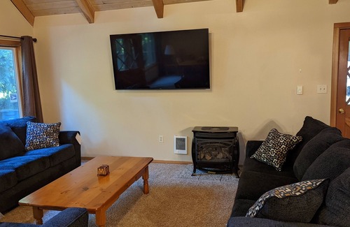 The Nisqually Hideaway is well appointed for your comfort and entertainment during your stay. The full kitchen is complete with cooking and eating utensils and has been stocked with common appliances. Laundry facilities are provided with a full-size washer and dryer. There is seating for three at the bar and six at the dining table. Our living room has comfortable seating for seven to accommodate your family and guests. The Nisqually Hideaway has free wi-fi and a 4K smart TV for connectivity. We also have provided a large assortment of board games that can be enjoyed on the oversized coffee table in the living room. There are two bedrooms; the main floor bedroom has a queen size bed, and the loft bedroom which also has a queen size log bed. The Nisqually Hideaway can sleep up to four adults in the bedrooms and two children on the comfortable couches in the living room. Outdoor amenities include a gas grill, and an open fire pit.