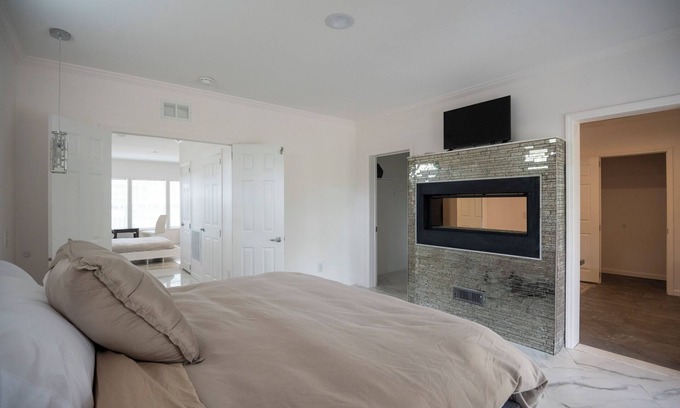 Retreat to the master bedroom, which leads to a spa-like bath or wide double doors that open to an expansive rear deck. The jetted tub, complemented by a two-way fireplace, provides the ultimate spa-like experience—perfect for soaking in a bubble bath or unwinding in bed.