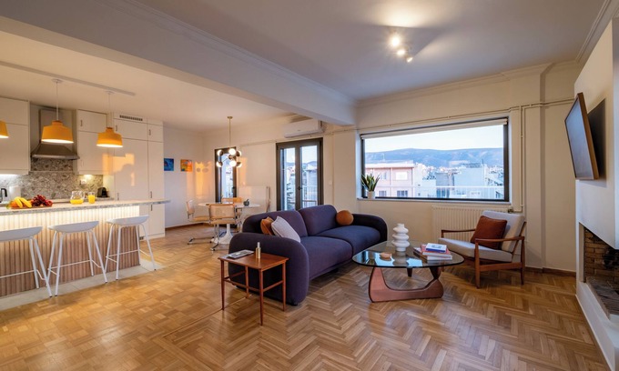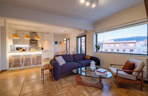 This stylish bright penthouse 2 bedroom/2 bath penthouse apartment is located in the heart of Athens offering stunning panoramic views of the Acropolis, Lykavittos and the whole city. Sunsets on its wrap-around balcony are breathtaking-taking. Two minutes' walk from Monastiraki metro station and direct line to the airport and Piraeus Port. Also, walking distance from the Acropolis, Monastiraki Flea Market, Ancient Agora, Plaka and all major sites. Your perfect base for experiencing both ancient and modern Athens. Located in the heart of the city, Athens' emerging dining scene and creative bars are at your doorstep.