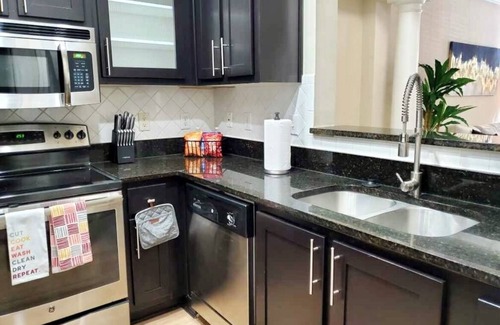 Experience luxury in this stylish 1BR, 1BA Atlanta suite, boasting 2 smart TVs, a full kitchen, and a cozy living room. Indulge in top-notch amenities, including a pool, gym, free parking, and high-speed Wi-Fi.