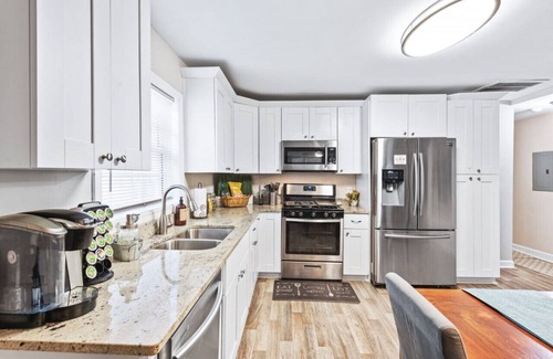 - Modern Amenities: Enjoy the convenience of a fully stocked kitchen equipped with stainless steel appliances, granite countertops, and a Keurig coffee maker, providing everything you need for meal preparation during your stay.