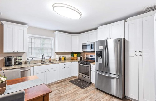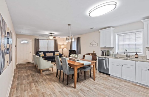 This beautifully renovated bungalow features essential amenities that cater to your wedding needs. You'll find a fully stocked kitchen complete with granite countertops, stainless steel appliances, and a Keurig coffee maker for those early mornings. Relax on the rocking chair front porch or gather on the back deck equipped with comfortable seating, outdoor dining space, and a charcoal grill—ideal for hosting small gatherings or mingling with friends and family. The modern bathrooms feature decorator-grade tile, and the bedrooms are furnished with comfortable beds and linens, ensuring a restful stay for you and your guests.