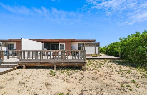 This delightful duplex features modernized amenities designed with comfort in mind. Each unit includes two bedrooms—one with a Queen bed and the other with twin beds—along with a cozy living/dining/kitchen area equipped with streaming TV, microwave, and dishwasher. Enjoy the outdoors with over 1,000 square feet of synthetic decking, a screened porch, and an enclosed outdoor shower which enhances your beach experience. Additional perks include wireless internet access, beach chairs, and a charcoal grill for post-ceremony cookouts. Accessibility features such as an access ramp and handrail in the bath ensure comfort for all guests, while thoughtful provisions like sheets and towel sets are provided for your convenience.