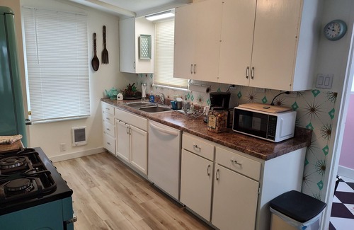 Immaculate Mid Century Modern Atomic Star Cottage. 1950's themed decor is a fun blast to the past. Comfortable living room with flat screen TV, WIFI. A fully stocked kitchen with gas range and refrigerator/freezer, includes dishes, glassware, pots and pans, utensils, microwave, coffee maker, toaster, blender, spices, sugar, tea and coffee. Guests provide their food items. The dining area includes a fun Martini bar, a Bose radio/CD player, and a selection of games and puzzles. The Starburst bedroom offers a scrumptious Queen size bed, a vanity table, a reading nook with books, and a full closet. The Martini Mermaid bathroom provides all your needs with towels, soaps, paper, and blow dryer. The Pink Pussycat laundry room provides a full sized washer and dryer with soap and dryer sheets. Enjoy the private back patio with table and chairs, shade umbrella, fountain, fire pit, and gas Bar-B-Q. The Atomic Star is your cozy little Home away from Home while you explore Klamath Falls and Klamath Lake. Three excellent Museums, Hiking trails along the Link River and Lake Ewauna. 1 hour to Crater Lake or The Lava Beds at Tule Lake.