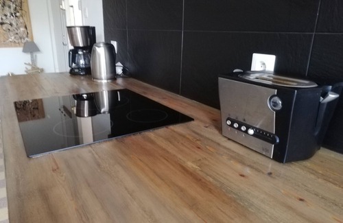 Large living room with fully equipped kitchen (induction hob, dishwasher, oven, microwave, coffee maker, electric kettle
