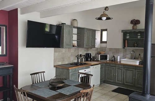Enter Gite L'Octroi at the side of the main building, into the private garden, where you hear the tinkling sound of the stream gently rushing through the rocks, alongside the walled garden of the gite. Here, the vine covered terrace with flower garden greets you. Sliding glass doors reveal an open living room and superbly fitted kitchen. A charming woodburning stove is in the living room for romantic inspirations or warming chilly nights. A flat screen TV with internet access, wifi, and smartTV are at your use for contemporary entertainment. A stairway leads up to the cosy mezzanine bedroom.