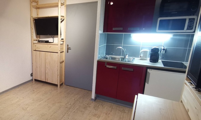 The studio is equipped with a microwave, traditional oven, refrigerator, induction cooktop, 6-place dishwasher, dishes and kitchen utensils, washing machine, Dolce Gusto coffee maker, television, and raclette grill.