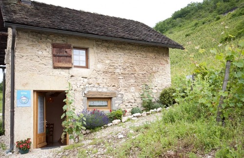 Traditional Bugey stone barn (44 sq.m.) in peaceful, flower-decked village. Countryside setting, surrounded by vineyards. Detached with accommodation on 2 floors. Living room/well-equipped fitted kitchen, shower room/WC. 1st floor: large bedroom (double bed), lounge area (sofa bed available). Bedroom opens directly onto back of gîte & terrace (garden furniture, BBQ). Steep stairs, parking. Heating: underfloor & electric. Owner's wine cellars nearby: local Bugey wine for sale. Optional cleaning charge: 20€. Near the Vallée Bleue (sports activities). Canoeing/kayaking 6km. Via Ferrata (assisted rock climbing), climbing 3km.