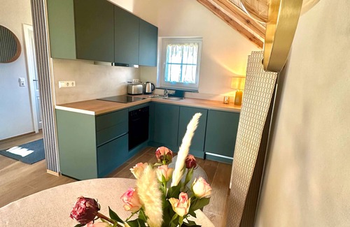 The apartment is comfortably furnished and is ideal for couples or solo travelers who value being close to nature. Shops and sights can be reached in just a few minutes by car. There is a bakery and two restaurants in the village. The 40 m² apartment has one bedroom and one bathroom and can accommodate up to three guests. You have access to a private, fully equipped kitchen as well as Wi-Fi, TV and video-on-demand for your entertainment. Relax in the private garden or on the balcony and enjoy the peaceful surroundings. A communal parking space is available at the house. If needed, a convenient and flexible self-check-in is possible. If you have any questions about excursions, shopping or culinary tips, we are happy to assist you.