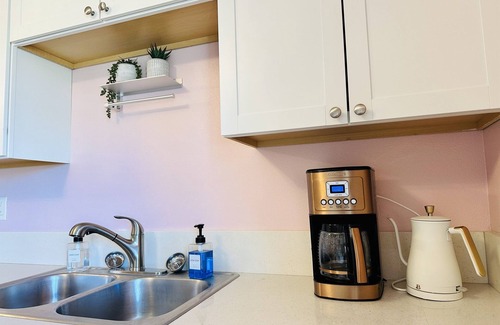The overhead chandeliers bathe you in golden light, as you ready at the vintage vanity. A Bluetooth phonograph plays your favorite tunes, as you lounge on the velvet loveseat, with a gin & tonic in hand. This gorgeous one-bedroom apartment, full of natural light, has a full kitchen, dining space, and a stand up shower. The bed is a comfortable queen memory foam mattress, and there is an adjacent area with a twin daybed and trundle.