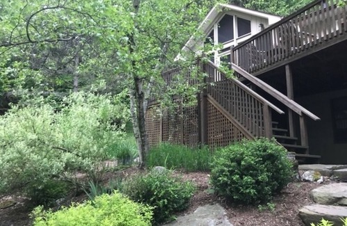 Built into a hill, this secluded house offers an in-ground pool and screened-in porch (with a full dining table) to enjoy all summer long. During the winter months, skiing is available nearby and the slopped driveway offers the perfect sled route.