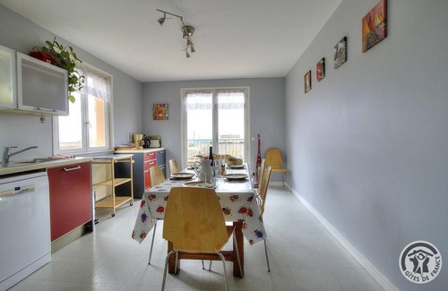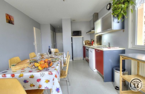 At the heart of the Beaujolais, close to the city of Belleville, gîte on a winegrowing estate also including a vat-room and owners', winegrowers, home. Guests will enjoy relaxing on the large terrace with lovely views of the surrounding vineyards and The Alps on clear days. Tasting of estate wines available on site. Upstairs : living room (opening onto the terrace) with fitted kitchen area, lounge with single sofa bed, 2 bedrooms (double bed) (2 single beds) each one with private facilities (shower, washbasin, Wc). Storage area (washing machine). Household linen provided. Sun beds, unfenced adjoining garden, carport, play area (swing, toboggan, basketball hoop). Private pond for fishing 1 km away. Also perfect for a business trip.