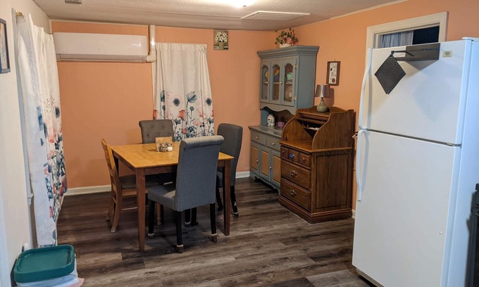 This 645 sq ft one bedroom cottage has been recently updated as the photos show! I love this place and so have my guests! With a large shared backyard with my 2 bedroom cottage, it faces the river and is very relaxing. A cozy enclosed in porch is your entrance to the to the keyless entry door which opens into the kitchen.