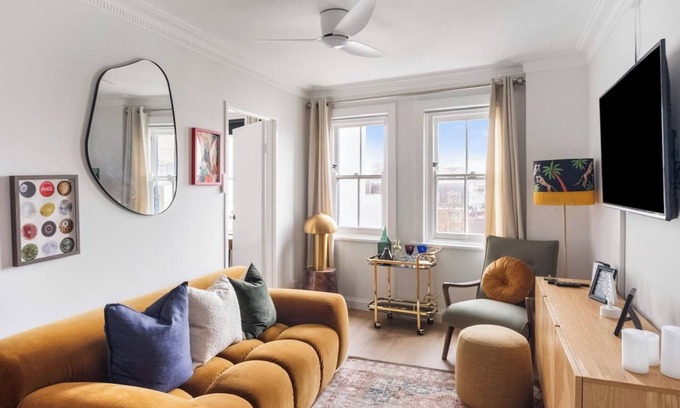 Tucked within one of Sydney’s most dynamic postcodes, this chic apartment blends comfort and character in a single-level setting. Inside, the living area feels straight out of a design magazine, styled with vibrant colours and mid-century modern flair. Sink into the mustard-toned sofa, stream your favourite Netflix series, and mix a cocktail at the vintage-style brass bar cart. Stylish details such as sculptural lighting and distinctive artwork set a tone that’s both playful and elegant.
