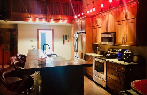 Enjoy a wonderful luxury home experience on one of northern Michigan's most famous rivers. The two-and-a-half bathroom home has three bedrooms and two loft rooms that are versatile and can accommodate a number of guests. The outdoor deck (riverside), the many windows, and the long kitchen bar are among the many unique features. However, the Rumford fireplace with Black River Michigan stone on the exterior is the centerpiece attraction. The house also features a three-zone geothermal heating and cooling system. The upper lofts are reached by ascending an iron-rod spiral staircase.