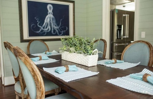 The outdoor living space is truly dreamy! Multiple picnic tables are situated under twinkle string lights and nestled between 100 year old oak trees. The playscape, playhouse and sandbox are sure to keep your kiddos busy for hours! And the pool area includes a beach entry, grotto with waterfall, hot tub, and a full outdoor grill area with a gas grill and a Green Egg smoker.