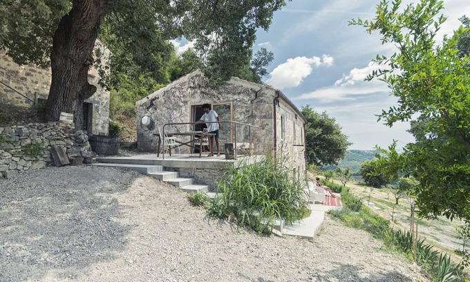 Farm in the hills on the Adriatic coast. 35 min drive to beach. Located in a quiet and beautiful hilly agricultural area. Property consists of 2 buildings that are built around the terrace. In the main house is the kitchen, the living room, two bedrooms and a bathroom. In the second building are cantina (storage room), bedroom and bathroom. The building has three terraces. The house faces south and gives a view of the 20,000m2 domain, the surrounding valleys, a small village on the hill in the distance and the sea. A private road of 100m takes you up to the house. The swimming pool is located 50m from the house and also has valley and far sea view. On the domain is an olive grove, garden and all this then passes into the nature reserve that consists of forest.