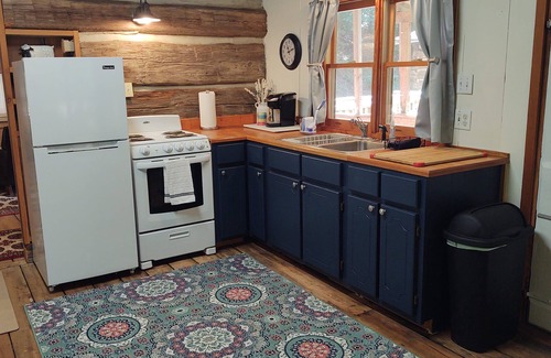 Enjoy staying in an early 1800s log cabin with modern amenities. The Red Roof Cabin has a wrap around porch overlooking the stream, a full kitchen and bath, a large bedroom and wooded trails just steps away.